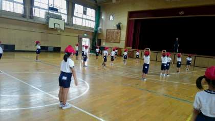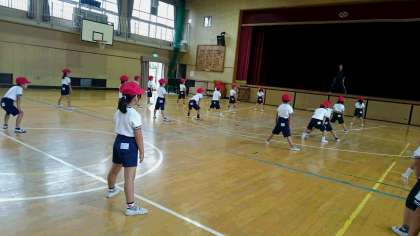 1年生の体育の授業です。身体をしっかり伸ばすことがとても上手になってきました。前の先生の様子をしっかり見ています!