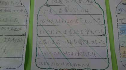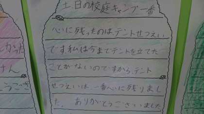 4年生は土日の校庭キャンプのお礼の手紙を書きました。楽しかった様子がよくわかります。保護者のみなさん、OBのみなさん、本当にありがとうございました。