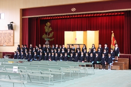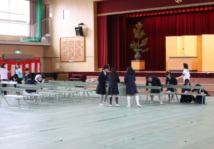 春休み中ですが、新6年生が入学式の準備のために登校しました。講堂のいすを並べてきれいにふいたり、廊下をはいてくれました。