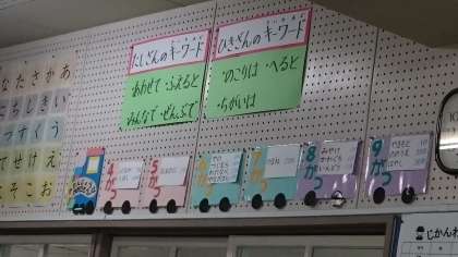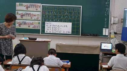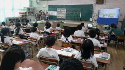 算数のひき算のところです。先生がたくさん見に来るので喜んでいる児童もいます。先生の質問に元気よく答えています