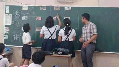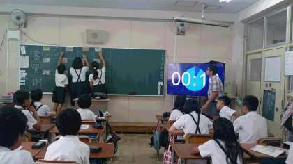 英語の授業です。英単語が黒板に書いてあります。それを絵であらわします。10秒以内で!難しい!