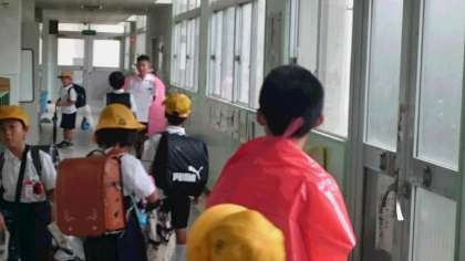 あいさつ運動2日目です。廊下にあいわつレンジャーが登場!しっかりあいさつできた人にはシールが配られます。1年生ははりきっていますよ!