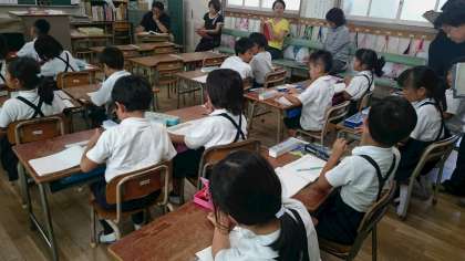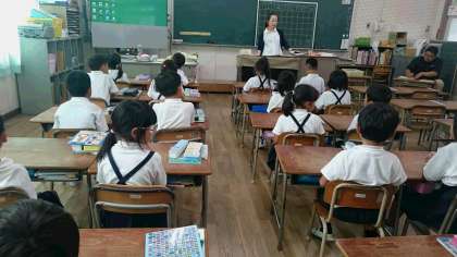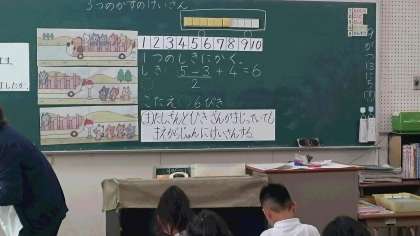 1年生算数。今日は算数の研究授業です。いつもよりたくさんの先生が来られて少し緊張しています。