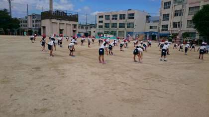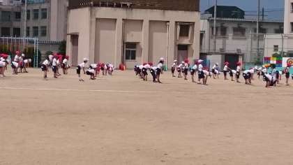 初めての運動会でラジオ体操をします。しっかり体を伸ばしてね!だんだん上手になってきました。