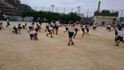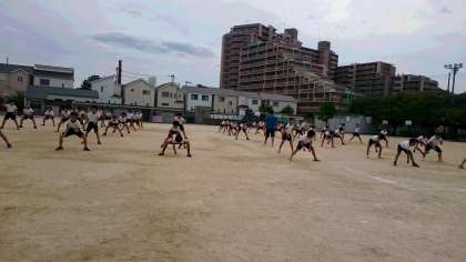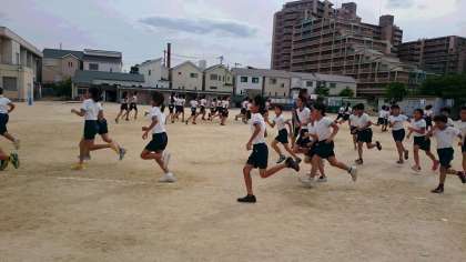 運動会の練習。一番声のでている学年です。林間学習での団体行動学習の効果が出ています。元気いっぱいの姿を期待ください。