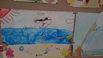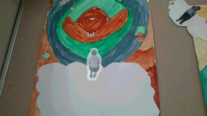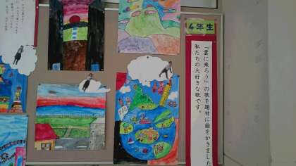 今月の掲示は4年生。雲にのって飛んでみました。いろんな風景が見えます!