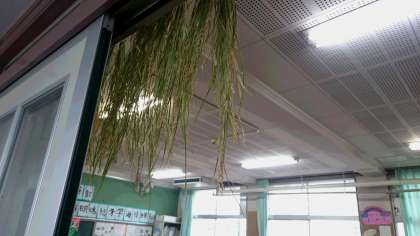 田んぼの稲を戸口に飾っています。田んぼのお米はスズメもたくさん食べてしまったようです。
