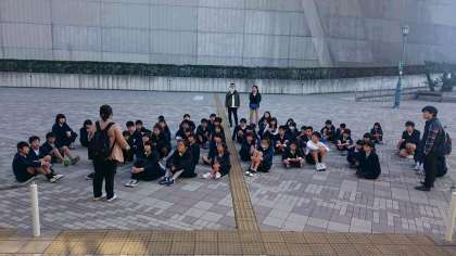橋の科学館に入ります。入館の注意を聞いています。