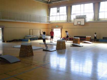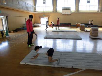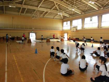 4年生が出前授業で跳び箱の活動に取り組みました。めあては、安全に楽しく跳べるようにです。写真は、スプリングボードでジャンプして、両手両足で安全に着地を練習する様子です。