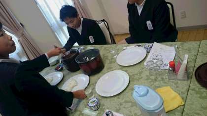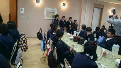 震災記念館に到着。「お腹がすいたー!」今朝は早かったものね。