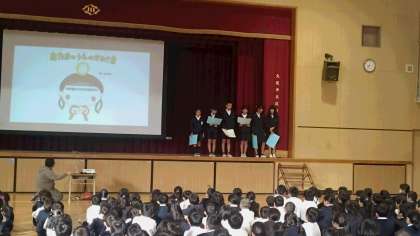 今日の集会は図書委員会からです。図書委員の人たちが絵本を読んでくれました。