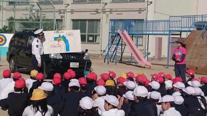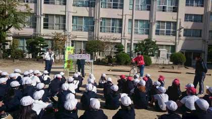 今日は都島警察から交通安全の指導に来ていただいています。都島区役所や見守り隊の方にも協力いただいてしっかり学習しましょう!