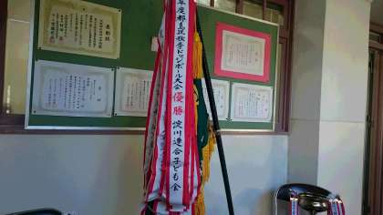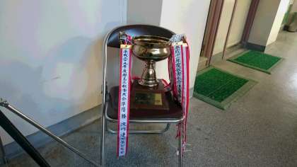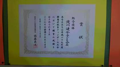 今日の朝会でドッジボール大会の表彰を行いました。総合優勝の楯は大変重いです。6年生が引退したので次は5年生です!