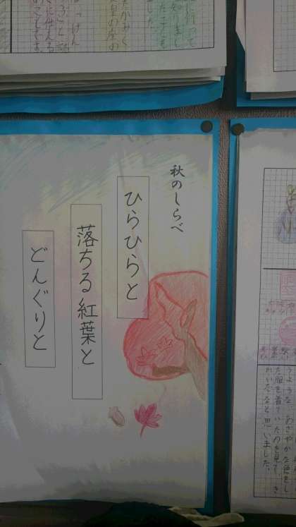 社会の時間は隣の担任の先生と入れ替えています。しっかり勉強しています。教室後ろの掲示板には「秋の一句」がはってあります。懇談のときにはじっくりご覧ください。
