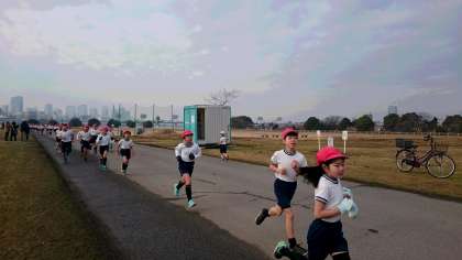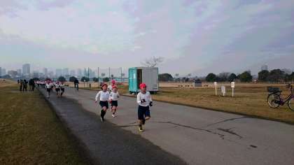 数日前よりは少し暖かく感じる今日、淀川河川敷でかけ足大会を実施しました。3年生がスタート、4年生が少し遅れてスタートしました。