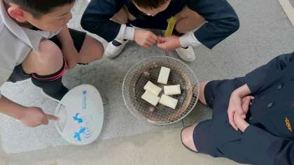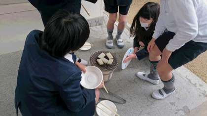 3年生が「お餅を焼く」体験をしました。普段はみたことのない「七輪」に炭を入れて焼いています。「まだふくらんでいないよ!」