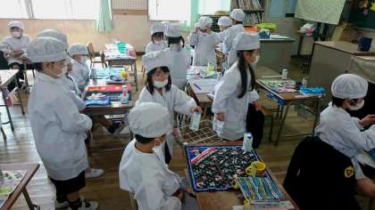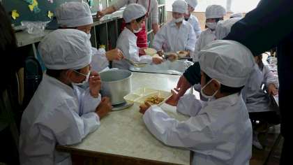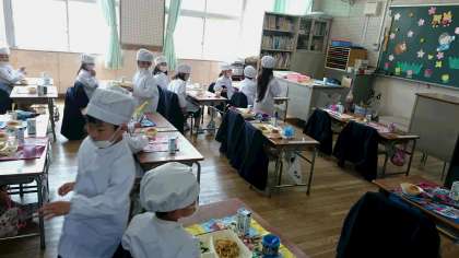 1年生が小学校初めての給食です。上手に配っています。今日のメニューは「やきぞば・きゅうりのあえもの・パン・牛乳」です。