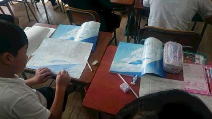 1組は算数、2組は国語の授業です。高学年になり勉強が難しくなります。みんなしっかりと授業に取り組んでいます。