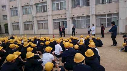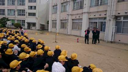 今日は消防署の方々に来ていただいて避難訓練を実施しました。教室からの避難はスムーズにできてきました。2分少しで避難ができました。「水消火器」の体験もありました。4人の先生が消火器の使って消火活動を体験しました。
