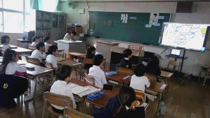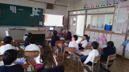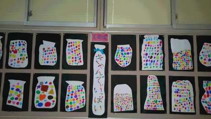 ピロテイの掲示板には1年生の図工作品を展示しています。キャンデイをいっぱい描きました!朝の時間には「桃太郎」のお話を聞いています。