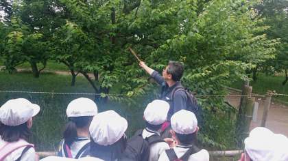 自然園では村上先生が鳥の鳴き声や樹木の説明をしてくれます。とても興味をもって聞いています。
