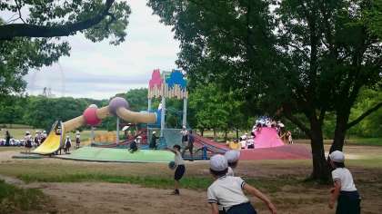 昨日の雨で広場がぬかるんでいました。お弁当は花の丘で食べることになりました。
