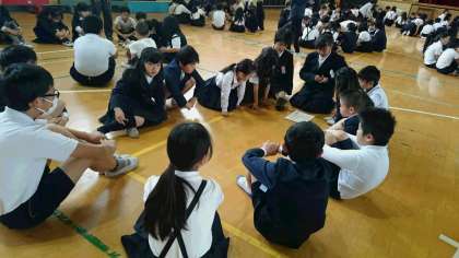 縦割り班での集会です。自己紹介と班長さんから班の目標を示されました。