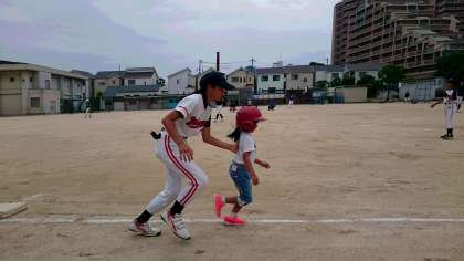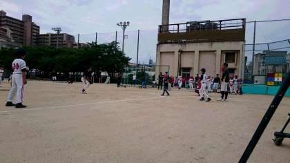 PTA主催の「親子ソフトボール大会」です。低学年も参加して練習とゲームをします。1年生も出塁しました!