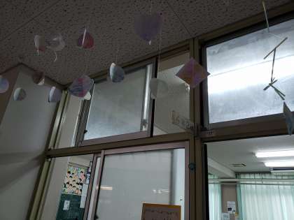 4年生は「紙と水のまほう」の授業です。1組・2組の教室前にはとてもかわいい作品がつるさげられています。