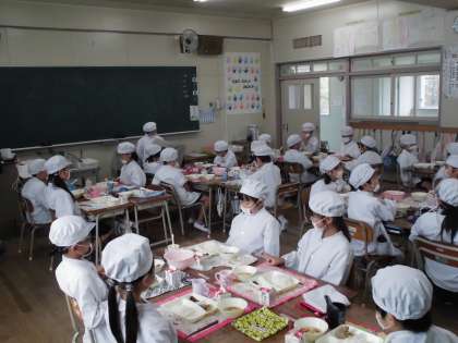 今日の給食は、豚肉の甘辛焼き、みそ汁、オクラのおかかいため、米飯、牛乳でした。写真(下)は、2年生の給食の様子です。姿勢を正しくして「いただきます!」