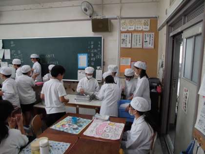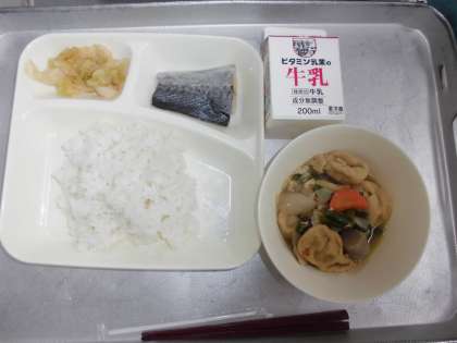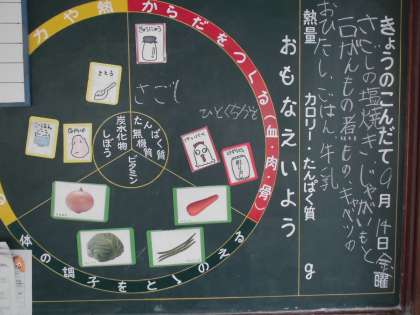 今日の給食は、さごしの塩焼き、じゃがいもと一口がんもの煮もの、キャベツのおひたし米飯、牛乳です。写真下二枚は、給食委員会の子どもたちが毎日取り組んでいる給食の掲示板と5年生の配膳の様子です。