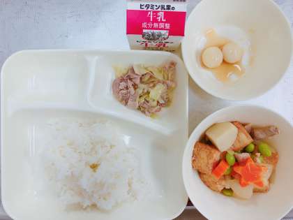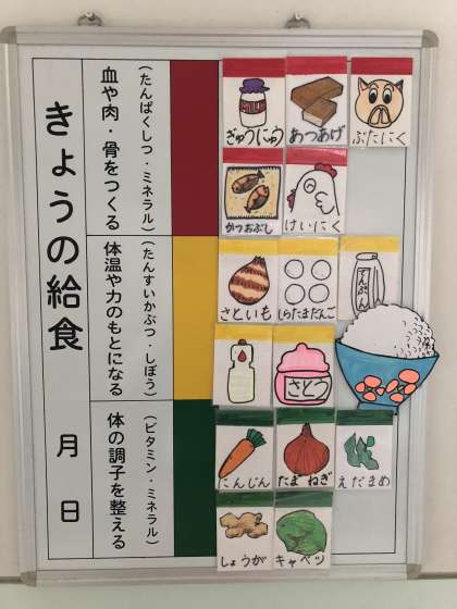 今日の給食は、鶏肉とさといもの煮もの、豚肉とキャベツのいためもの、みたらしだんご、米飯、牛乳でした。給食黒板には、3色の栄養について、給食委員の児童が、毎日丁寧に掲示しています。