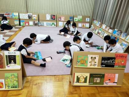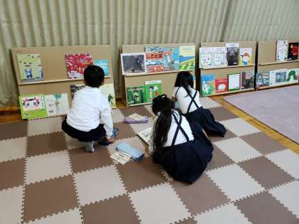 1年生「絵本のひろば」の時間です。図書室とは違った雰囲気で絵本に親しんでいます!