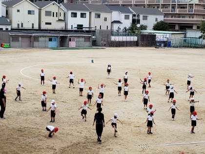 1年生はラジオ体操もできるようになりました。縄跳びに挑戦しています、ずっと続けられるのはだれかな?