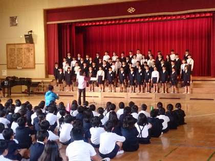 今日、児童朝会で、6年生が全校児童の前で、大阪市音楽交流会で合唱する曲を披露しました。美しい歌声でした。