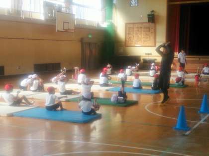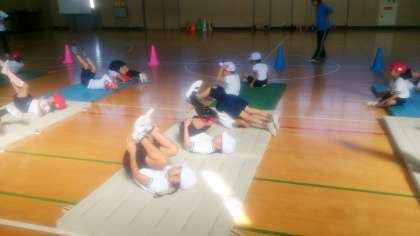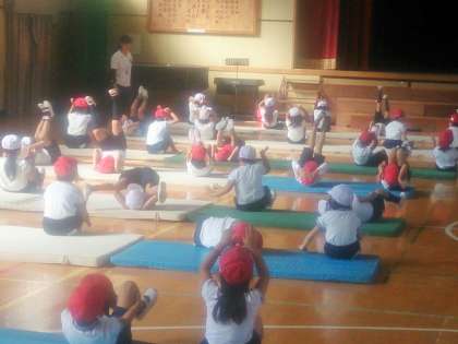 マットを使って、姿勢や方向を変えて, 回る, 寝ころぶ, 起きる, 座る, 立つ, 渡る等の動きによって、体のバランスをとる動きを身に付ける授業です。