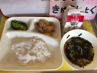 今日の給食は、豚肉のコチジャンいため、もずくスープ、ブロッコリーのナムル風あえもの、米飯、牛乳です。