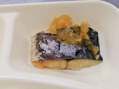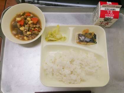 今日の給食は、さごしのおろしじょうゆかけ、五目豆、はくさいの甘酢あえ、米飯、牛乳です。