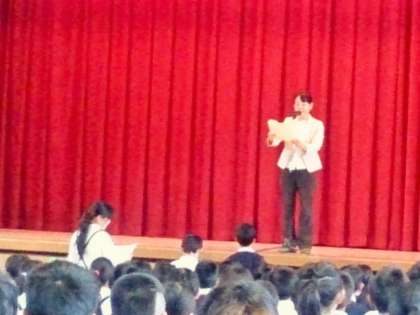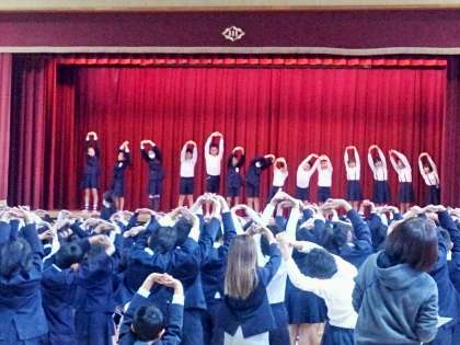 今日の児童朝会では、書写と読書の表彰がありました。最後に、保健委員会の児童が、舞台で「姿勢体操」の見本を見せ、全員で体操に取り組みました。