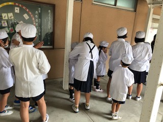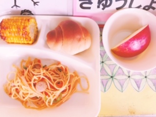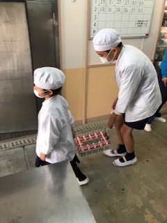 今日の給食は、チキントマトスパゲッティのほかに、焼きとうもろこし、りんご、パン 牛乳の献立でした。下の写真は、1年生と6年生が、給食を運んでいる様子です。高さを合わせるために6年生が優しく姿勢を低くしています。