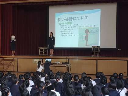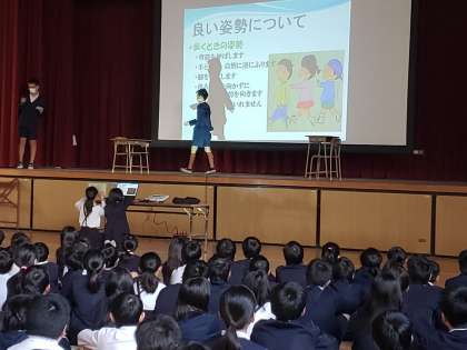 今年は「姿勢」について取り組んでいます。立つときの姿勢・歩くときの姿勢に共通することは「背筋を伸ばす」ことです。最後に姿勢体操をしました。