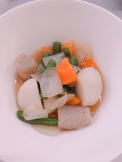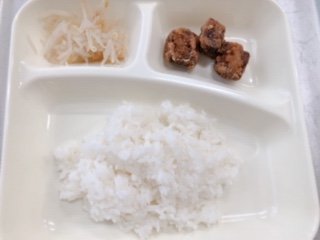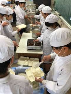 今日の給食は、くじらのたつたあげ、さといもと野菜の煮もの、もやしのゆずの香あえ、米飯、牛乳です。5年生の給食当番が、手際よく配膳しています。
