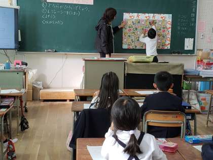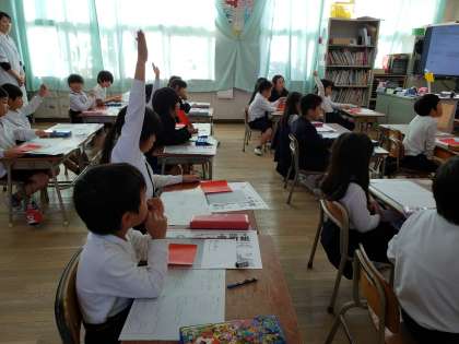 算数科の研究授業です。しっかりと手を挙げています。1年生はしっかりしてきました!