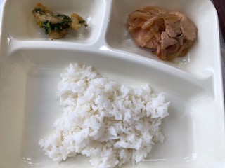 今日の給食は、鶏肉の甘辛焼き、みそ汁、きくなとはくさいのごまあえ、米飯、牛乳です。きくなは、きくの葉の形似いていて、特有の香りがあります。春にきくのような花を咲かせるので、春ぎくともいいます。