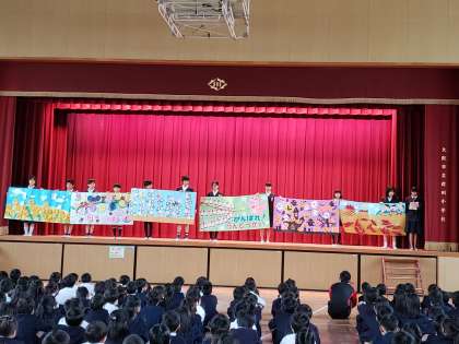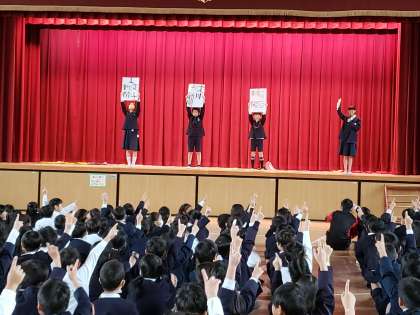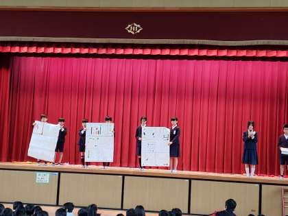 掲示・新聞委員会の発表がありました。「淀っこ新聞」作成や「玄関掲示」についてクイズもありました。