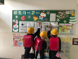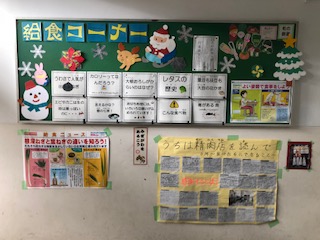 給食掲示版は、毎月テーマを変えて、掲示しています。めくって見たり、のぞいて見たりできるように、掲示方法も工夫しています。子どもたちも興味をもって見ています。今月は、「行事食」などを掲示しています。