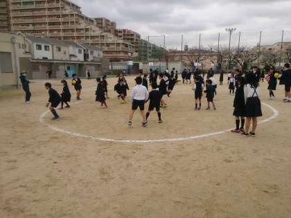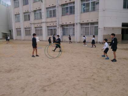 今日も、たてわり班でのみんな遊びがありました。フラフープや中あてなど、全学年で元気に遊びました。