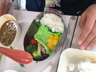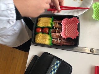 今日、6年生が家庭科調理実習に取り組みました。テーマは、「お弁当のおかずを作ろう!」です。食材は、卵、アスパラ、ベーコン、プチトマトで、給食献立の冬野菜のカレーライス、ブロッコリーのサラダ、黄桃等と合わせて、完成しました。おいしそうなお弁当の出来上がりです。
