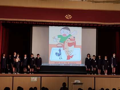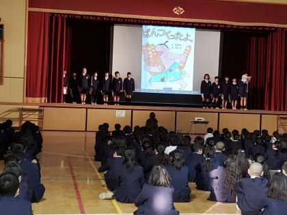 今日の児童集会は図書委員会の発表。「ぱんつくったよ」という絵本の紹介です。日本語は区切り方で意味が違ってしまいます。低学年にもわかりやすく朗読してくれました。