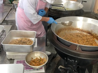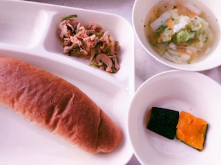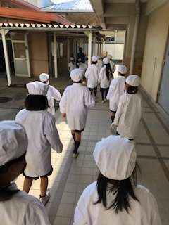 本日は、2学期最後の給食でした。メニューは、豚肉のケチャップソテー、はくさいのスープ、焼きかぼちゃ、ライ麦パン、牛乳でした。真ん中の写真は、豚肉のケチャップソテー調理中の調理員さんです。学年休業を終えた1年生も元気に給食を運んでいました。